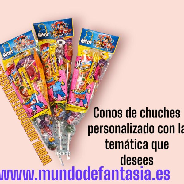 Bolsa de Chuches personalizados con tu nombre y edad PACK DE 12 unidades de conos de 40cm.,