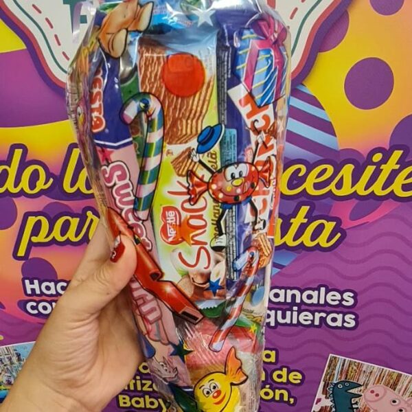 Cono relleno de 60 cm de chuches, chocolatinas y snack variados de primeras marcas.