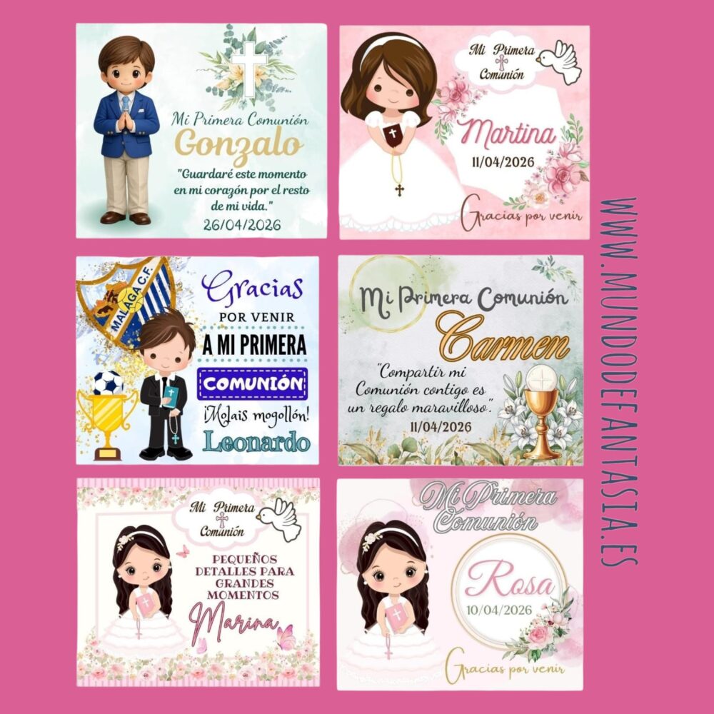 Esta etiqueta de 7x5cm. tiene un llamativo diseño lleno de color, diseñado con diferentes elementos típicos de comunión: puedes dejarnos una nota para especificar el modelo . ¡Muy divertido!