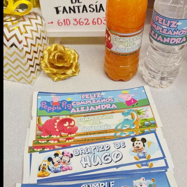 Etiquetas de agua pegatinas12 uds. Listo para para que tu misma prepares una mesa dulce original con la temática que quieras ideal para Comuniones, cumpleaños o cualquier Evento.