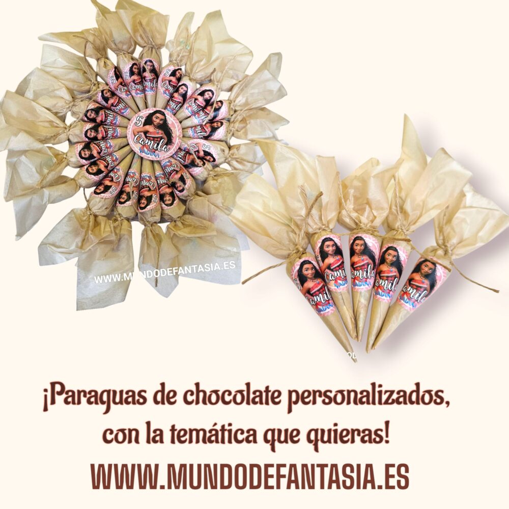 Paraguas de Chocolate personalizada listo para montar en la mesa, para que tu misma prepares una mesa dulce original con la temática que quieras ideal para Bautizo, cumpleaños, Comuniones y cualquier Evento.