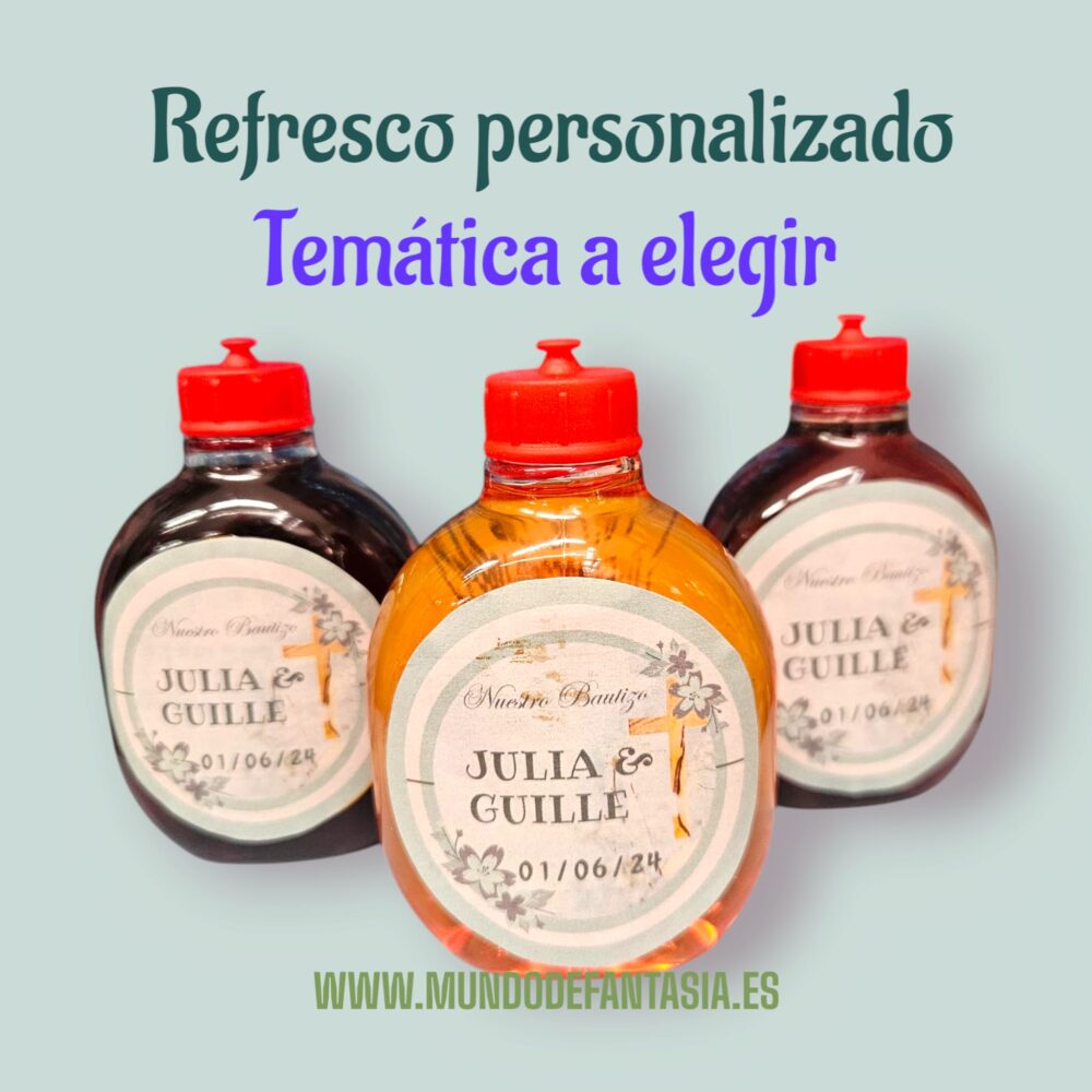 Refresco personalizado listo para montar en la mesa, para que tu misma prepares una mesa dulce original con la temática que quieras ideal para Bautizo, cumpleaños, Comuniones y cualquier Evento.