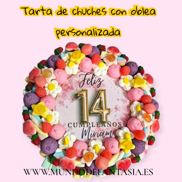 Tarta de chuches con oblea comestible Personalizada con tu temática preferida y listo para montar en tu mesa dulce o fiesta de cumpleaños.