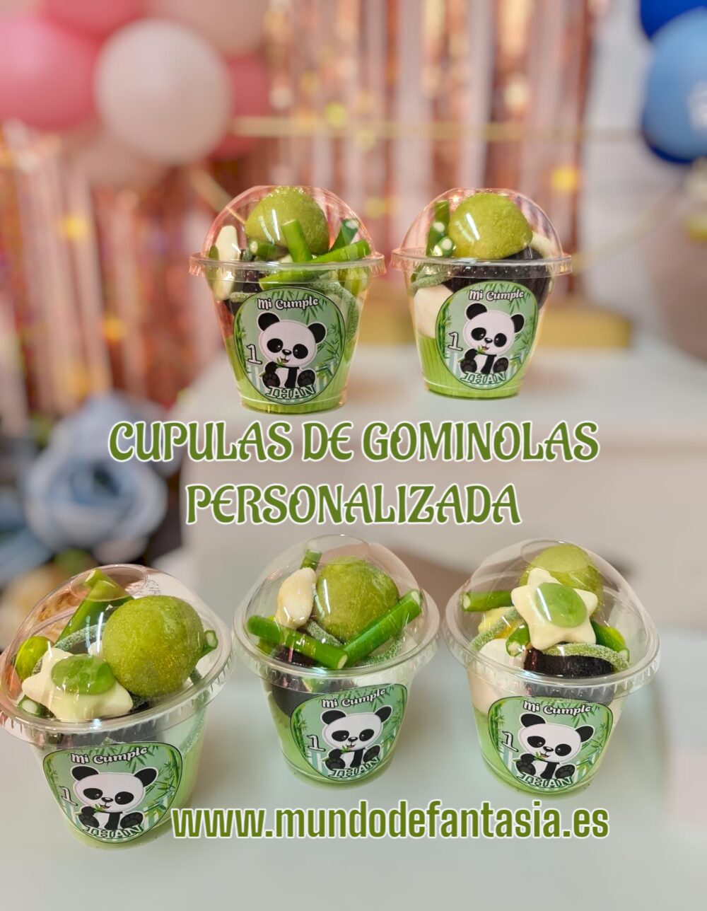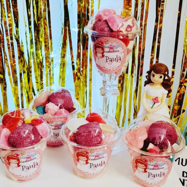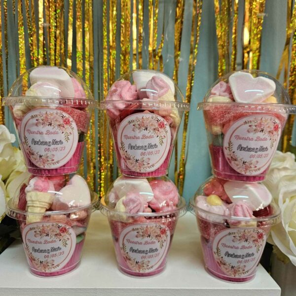 Vasitos de Chuches para tu evento personalizados en forma de cúpula con la temática que quieras, logo de tu empresa y la posibilidad de elegir gamas de colores.