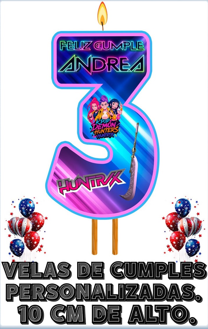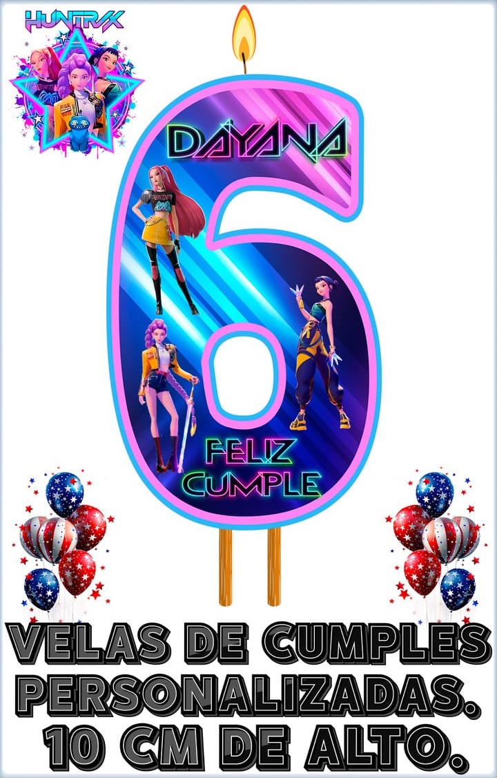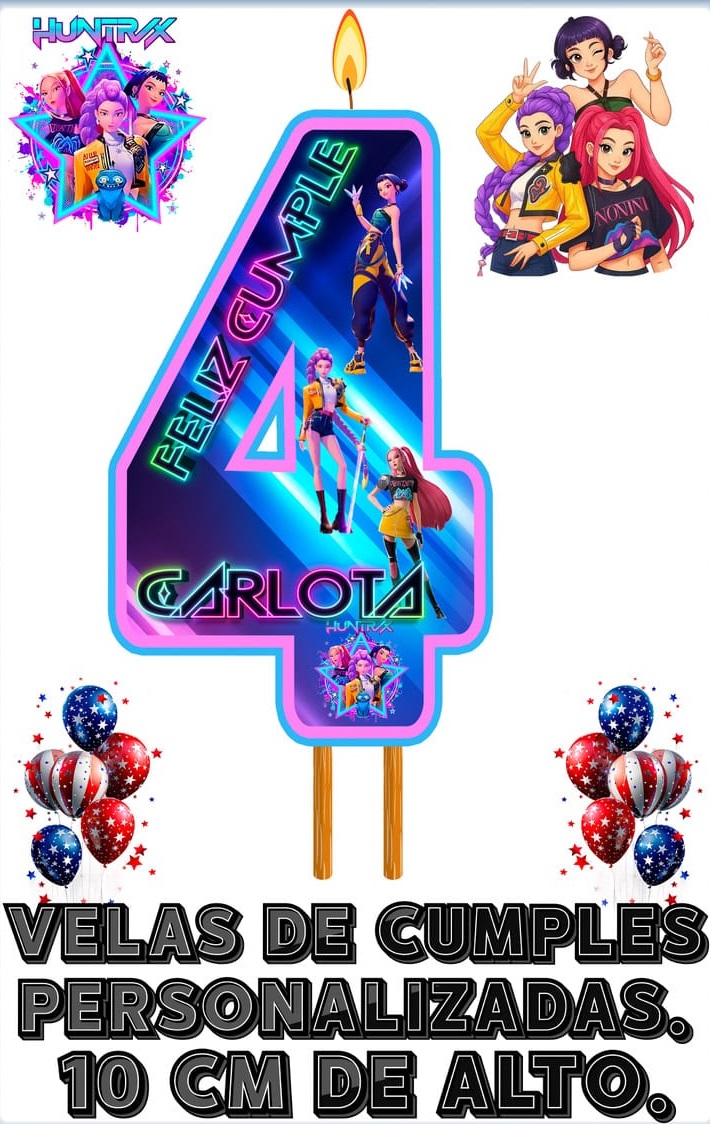 Sorprende a tu peque con esta vela personalizada con la temática de Las Guerreras del Kpop con su nombre y los años que cumple.
