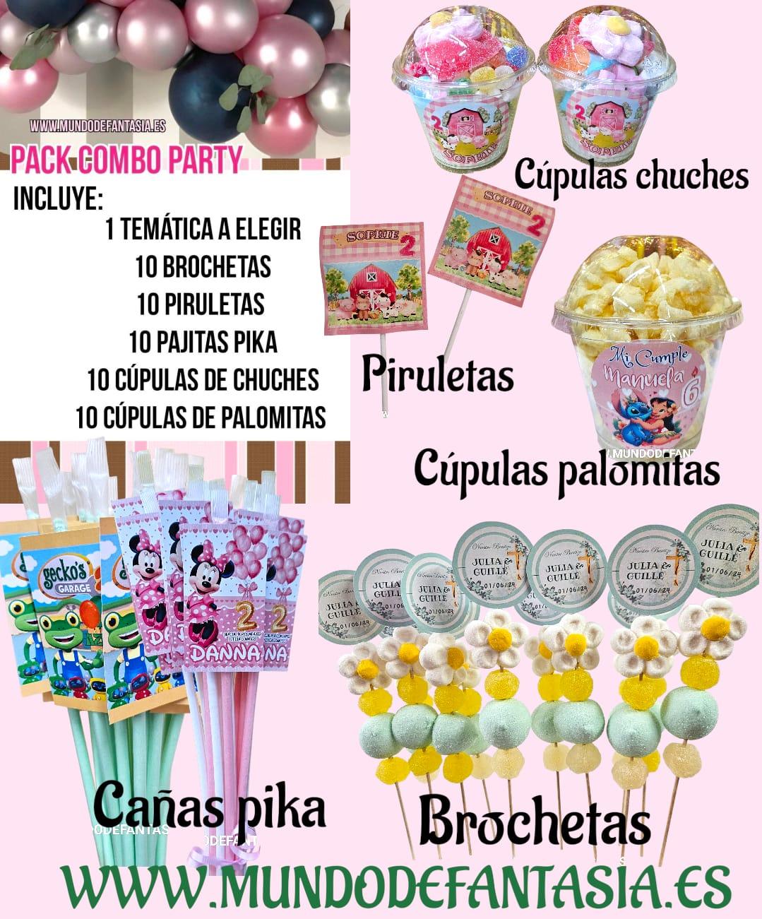 Pack Fiesta de Cumpleaños COMBO Golosinas. Se puede tardar 10-15 días laborables en personalizar el productoIncluye:1 Temática a elegir10 Brochetas Personalizadas 10 Piruleta Recordatorio10 Cúpulas de gominolas10 Pajitas pica-pica personalizadas 10 Cúpulas de palomitas personalizadasNo incluye base expositor.PERSONALIZACIÓN: tiempo de elaboración de 10 a 20 días laborables.Para pedido urgente de 4 a 6 días laborables, mas el tiempo de envio 24 a 48hs laborables, el costo extra es de 15€ consultar disponibilidad de este servicio.